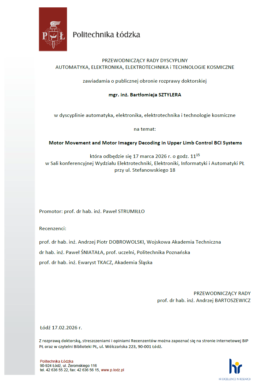 🏛 Obrona rozprawy doktorskiej odbędzie się 17 marca 2026 r. o godz. 11:15 w Sali konferencyjnej Wydziału Elektrotechniki, Elektroniki, Informatyki i Automatyki Politechniki Łódzkiej, ul. Stefanowskiego 18.